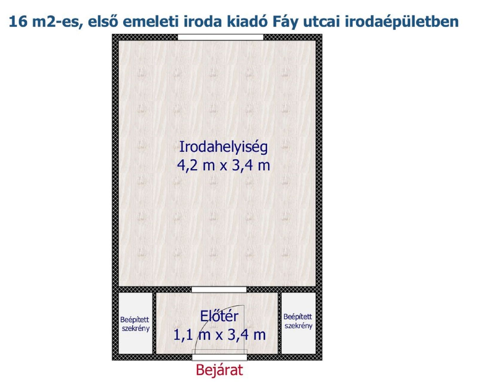 Az alaprajzon látható elrendezésben áll egy irodahelyiségből, valamint egy előtérből, ahol beépített szekrények segítenek abban, hogy az iroda rendezettek maradjon.
