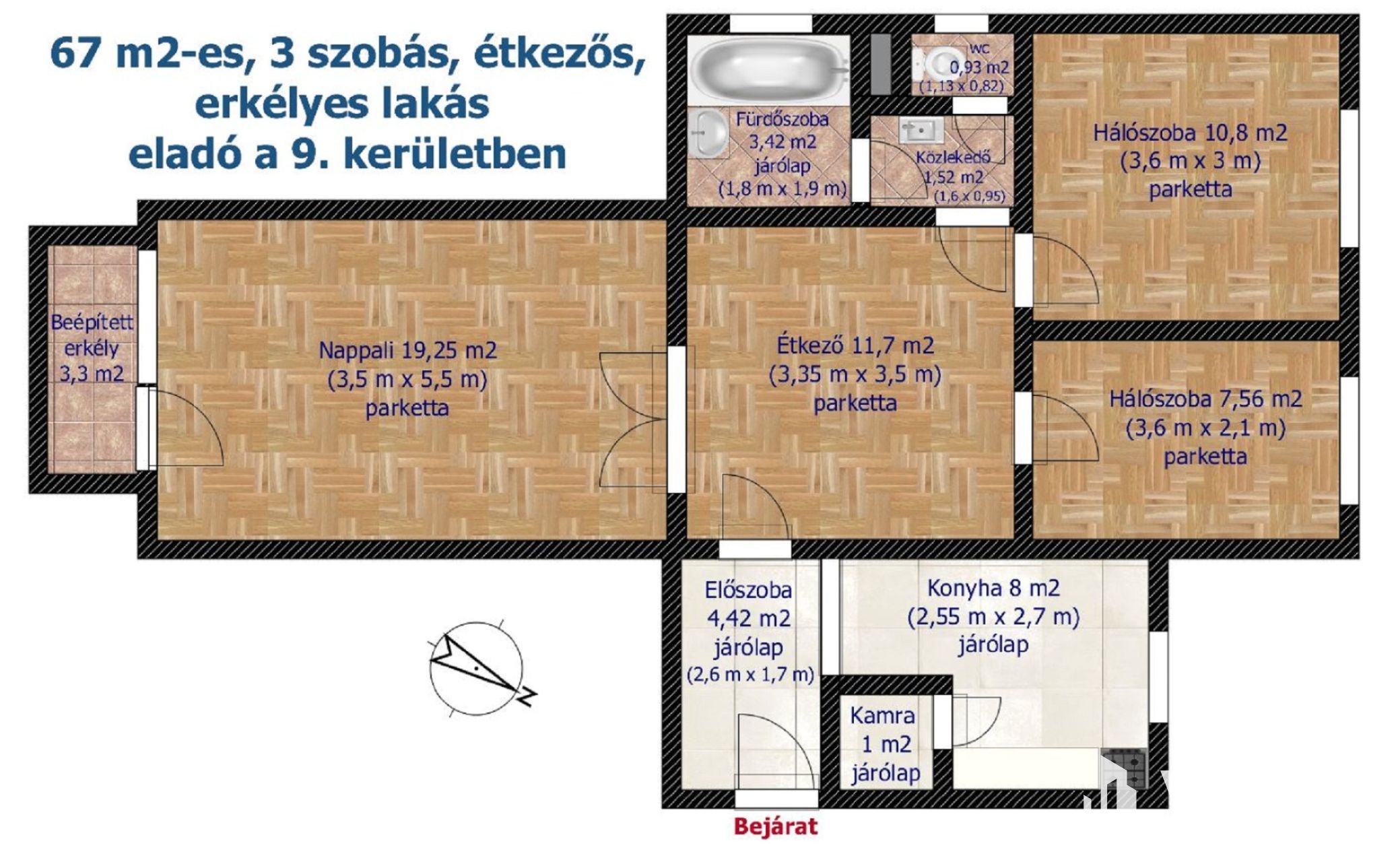 The 67 m², good-condition, practically arranged apartment – according to the floor plan – consists of a 19 m² bright living room facing southeast with access to the balcony, a separate kitchen with pantry, a 12 m² dining room, two bedrooms, a spacious entrance hall with built-in wardrobes, as well as a bathroom and a separate toilet.