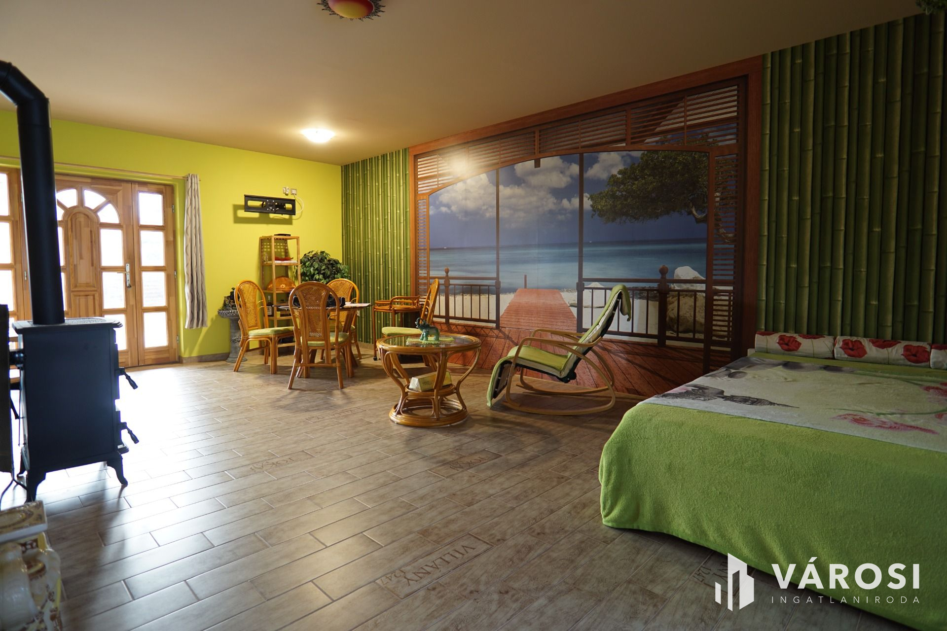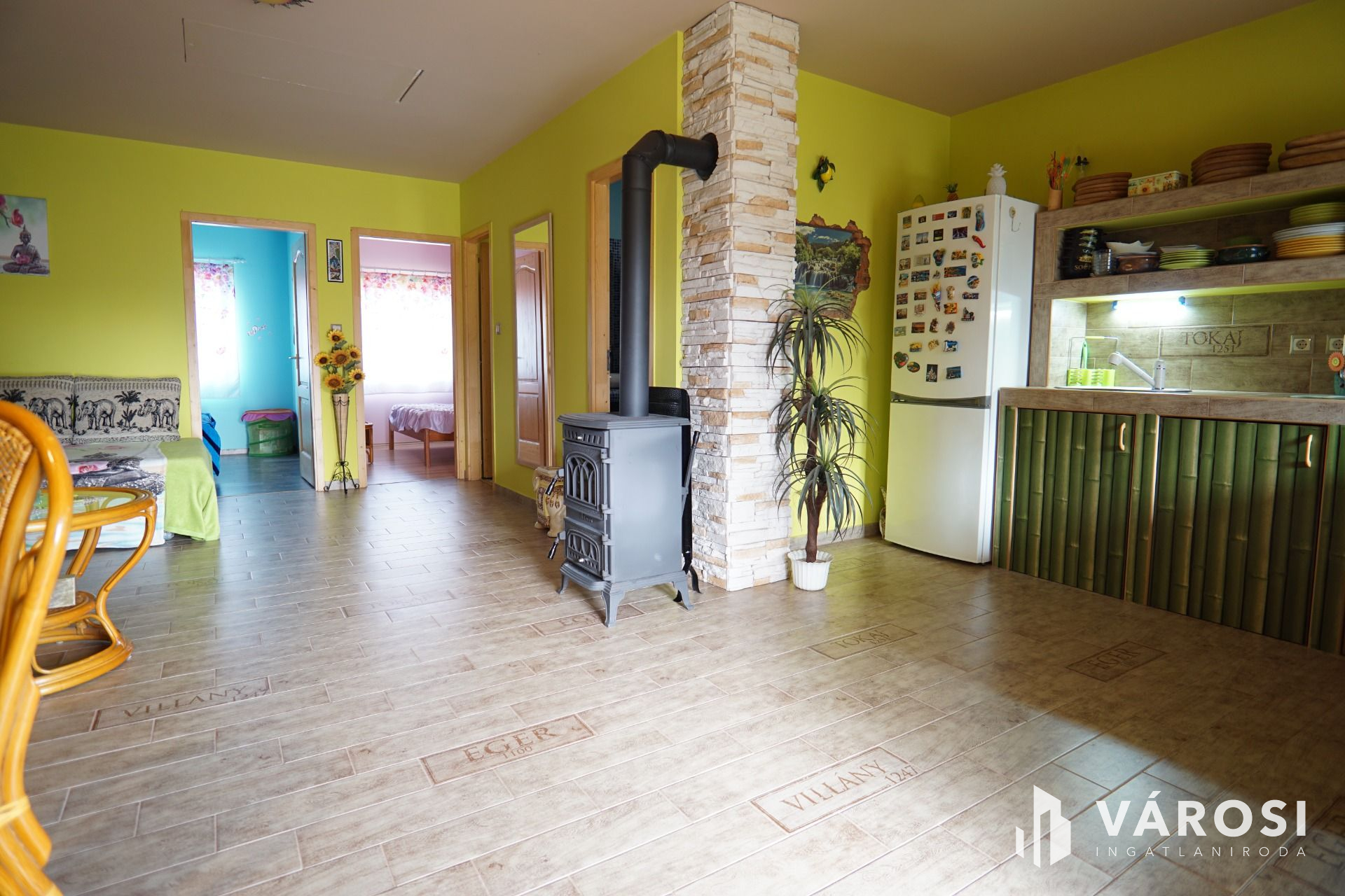 Az ingatlanban belépve egy nagy közösségi térbe, az amerikai konyha nappaliba érkezünk, melyből minden helyiség megközelíthető. Az utcafronton kialakításra került 2 külön bejáratú szoba, mellettük pedig a külön fürdő és a külön mellékhelység. Visszatérve a nagy térrel rendelkező közöségi térbe mely 36.5m-es, léphetünk ki a a fedett teraszra melynek a nagysága 22m2. Az épületbe bevetésre került a víz, a villany valamint a szennyvíz, a gáz pedig telekhatáron megtalálható. Fűtésről egy központilag elhelyezett nagy teljesítményű, öntöttvas kandalló gondoskodik. Az udvar igényesen parkosított, valamint még egy melléképület is található a telek hátsó részén. Gépkocsi parkolása az udvarba, fedett beálló alatt megoldott. A ház kamerarendszerrel felszerelt. Ha Ön szeretne egy csendes utcában, de nem túl távol a Balatontól egy jó kis ingatlant, amit akár télen-nyáron bármikor használhat, akkor ez egy jó választás lehet.