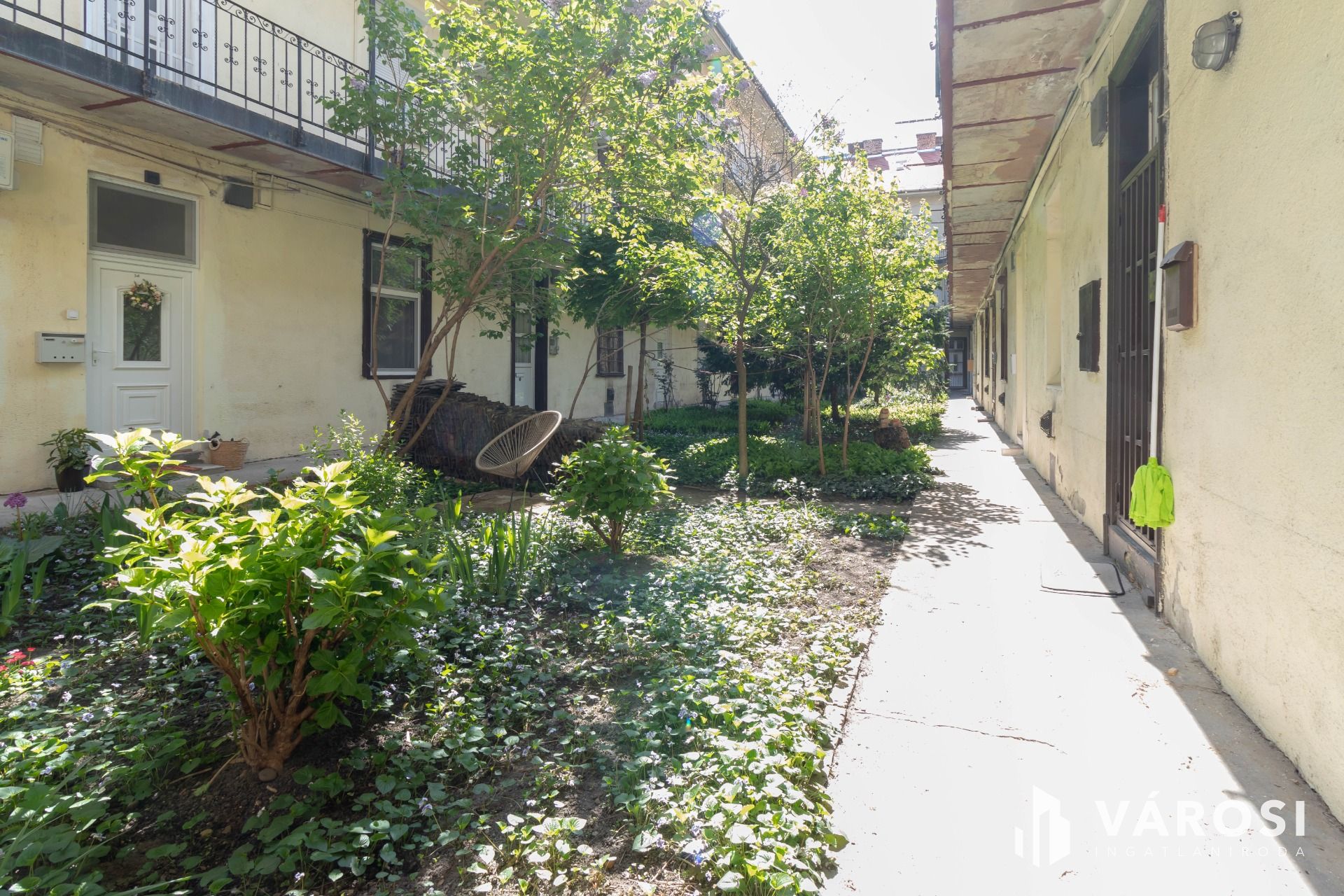 A lakás egy belső udvaros, 2 emeletes társasház földszintjén található. Az udvar rendben tartott, virágos, közös kerti csap is rendelkezésre áll.