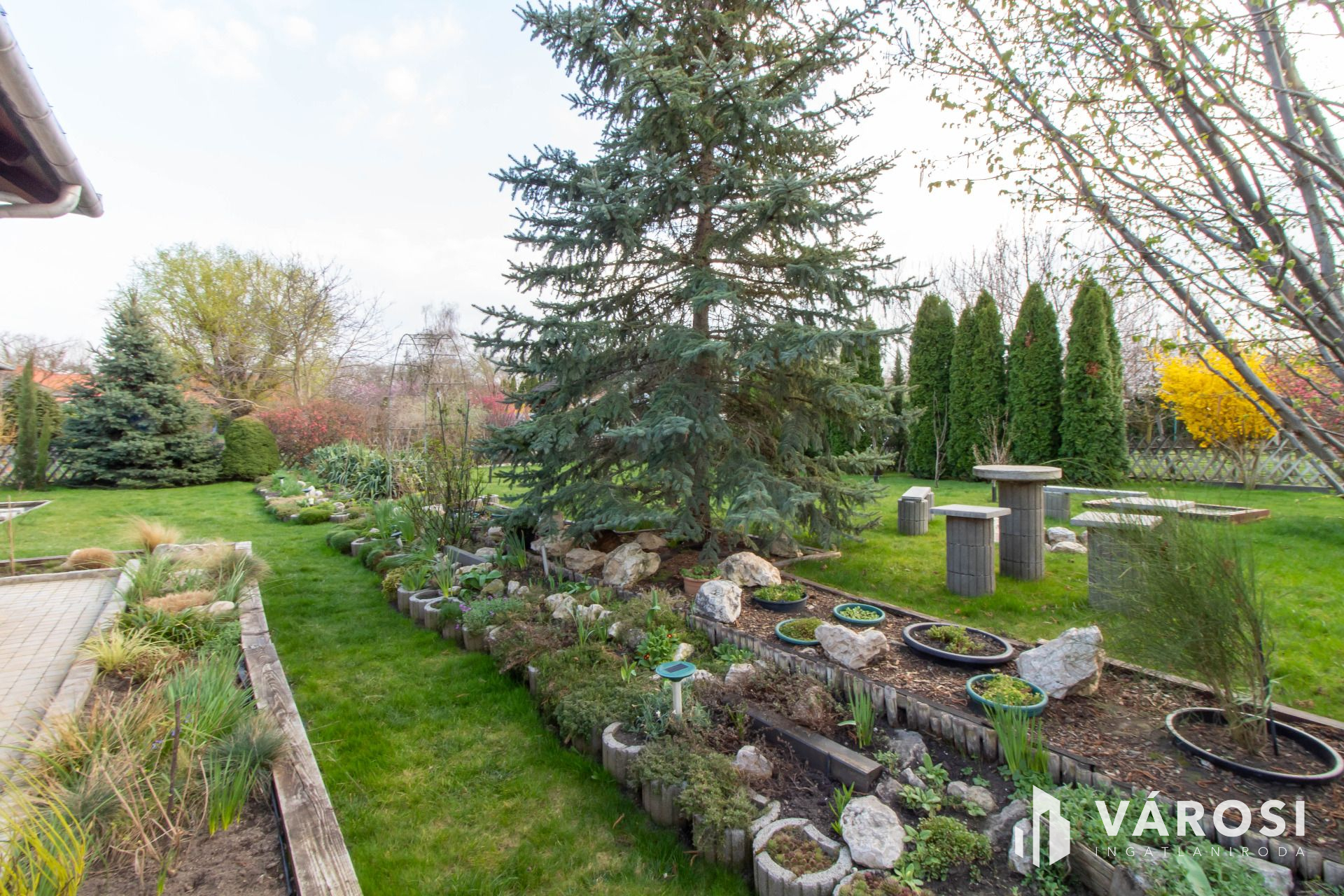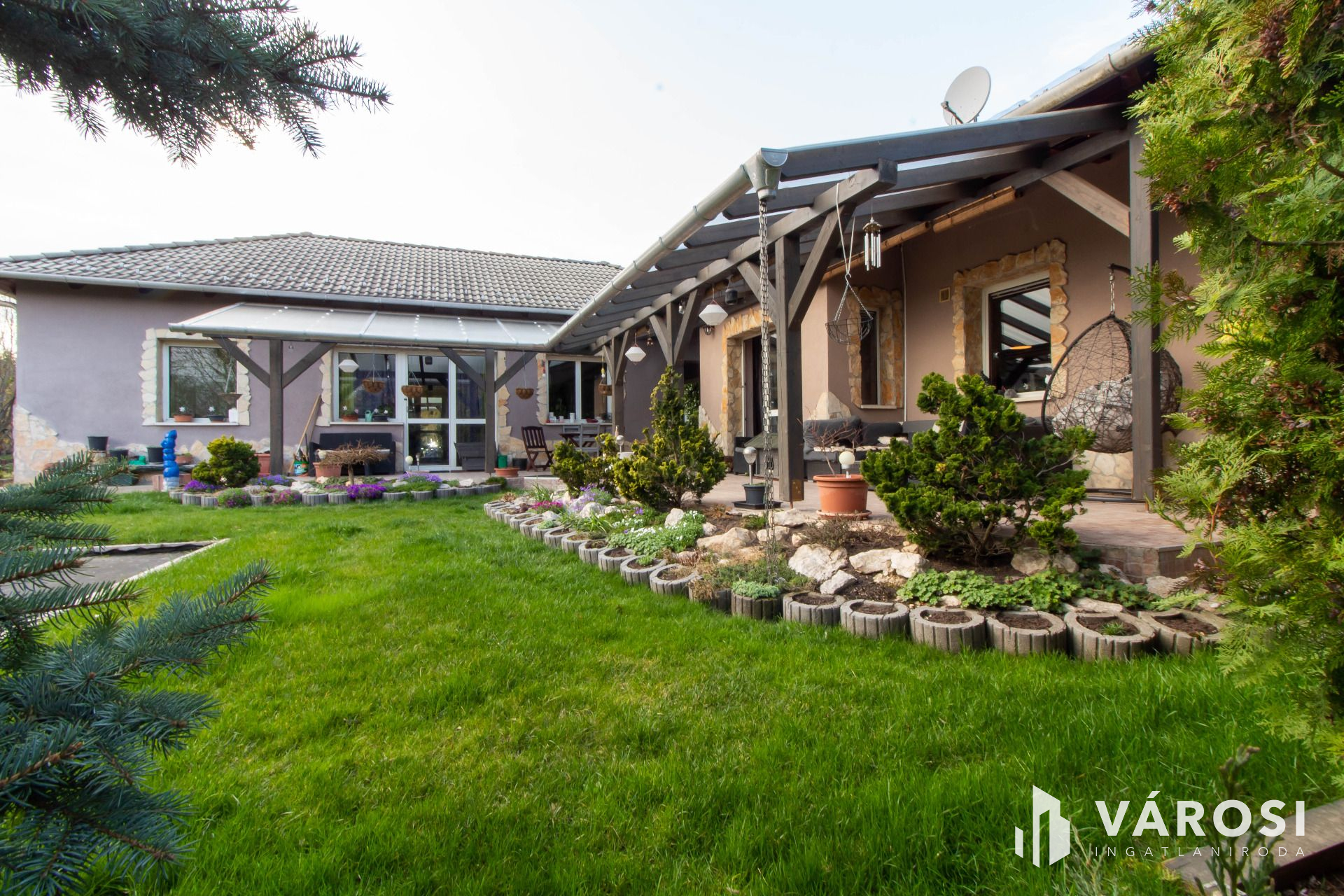 A gyönyörűen parkosított, gondozott udvar és a terasz pedig remek lehetőséget nyújt a kikapcsolódásra és a szabadidő eltöltésére.Továbbá egy fúrt kút és egy tűzrakó található a kertben.